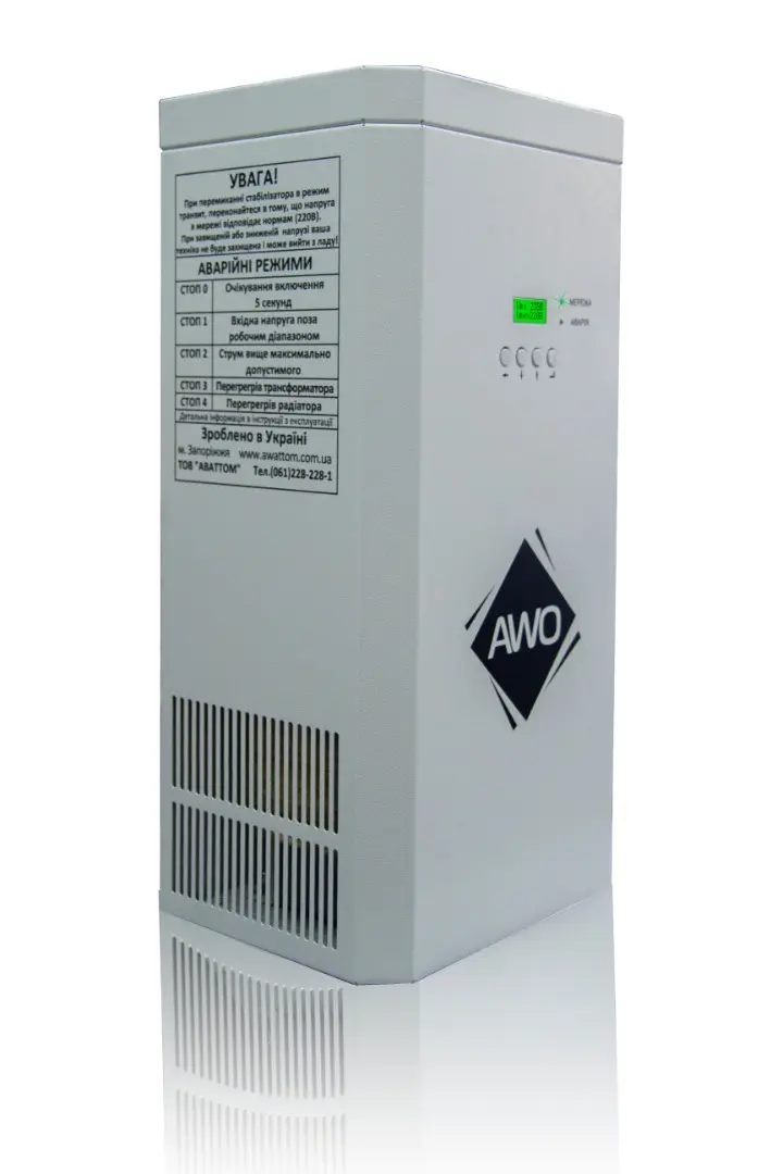 ІнструкціяОсобливості стабілізатора напруги торгової марки "Аваттом" серії New Silver Багато людей не замислюються про встановлення захисту на будинок або квартиру від нестабільного електроживлення мережі, до тих пір, поки не зіткнуться з певними складнощами, або перепадами напруги, які тягнуть за собою вихід з ладу Вашого дорогого устаткування. Щоб уникнути таких ситуацій ТМ "Аваттом" були розроблені стабілізатори напруги для будинку, квартири або дачі серії New Silver. Це можливо, самий не дорогий сімісторний, повністю електронний стабілізатор напруги в Україні який містить в собі стриманий, строгий зовнішній вигляд і найновіші технології, дозволяють Вам, поставити його і забути про всі проблеми з електромережею назавжди .Однією з переваг даної моделі стабілізатора є можливість установки його як вертикально так і горизонтально за допомогою кронштейна який йде в комплекті. А також габаритні розміри дозволяють встановити його навіть в невеликому приміщенні 470х240х155. Стабілізатори напруги серії New Silver виготовляються в лінійці з потужністю від 3.5 кВт, до 13,8кВт. Дані моделі забезпечують високий рівень захисту Вашого обладнання. Робота даної моделі забезпечується високоякісним трансформатором, намотаною на німецькій трансформаторної сталі відводи якого комутуються за допомогою сімісторів під управлінням мікропроцесора. Точність даної моделі складає 4% при роботі в діапазоні від 149 до 271 діапазон роботи від 141 до 285В що цілком достатньо для роботи побутових приладів. Стабілізатори напруги серії New Silver оснащені багаторівневим захистом. При виникненні аварії в мережі або в навантаженні, стабілізатор відключить навантаження від мережі і після усунення аварії автоматично підключить навантаження до мережі. Стабілізатор розрахований на безперервний цілодобовий режим роботи в закритих опалювальних приміщеннях. Також для Вашої зручності вбудований ЖК дисплей з підсвічуванням і виведенням інформації про вхідну, вихідну напругу, температуру трансформатора і силових ключів а також додатковим меню і зручним функціоналом.Щоб замовити продукцію ТМ «Аваттом» зверніться до наших менеджерів за номерами телефону 050-341-40-10 або 050-341-77-35 а також можете зробити замовлення у нас на сайті awattom.com.ua.